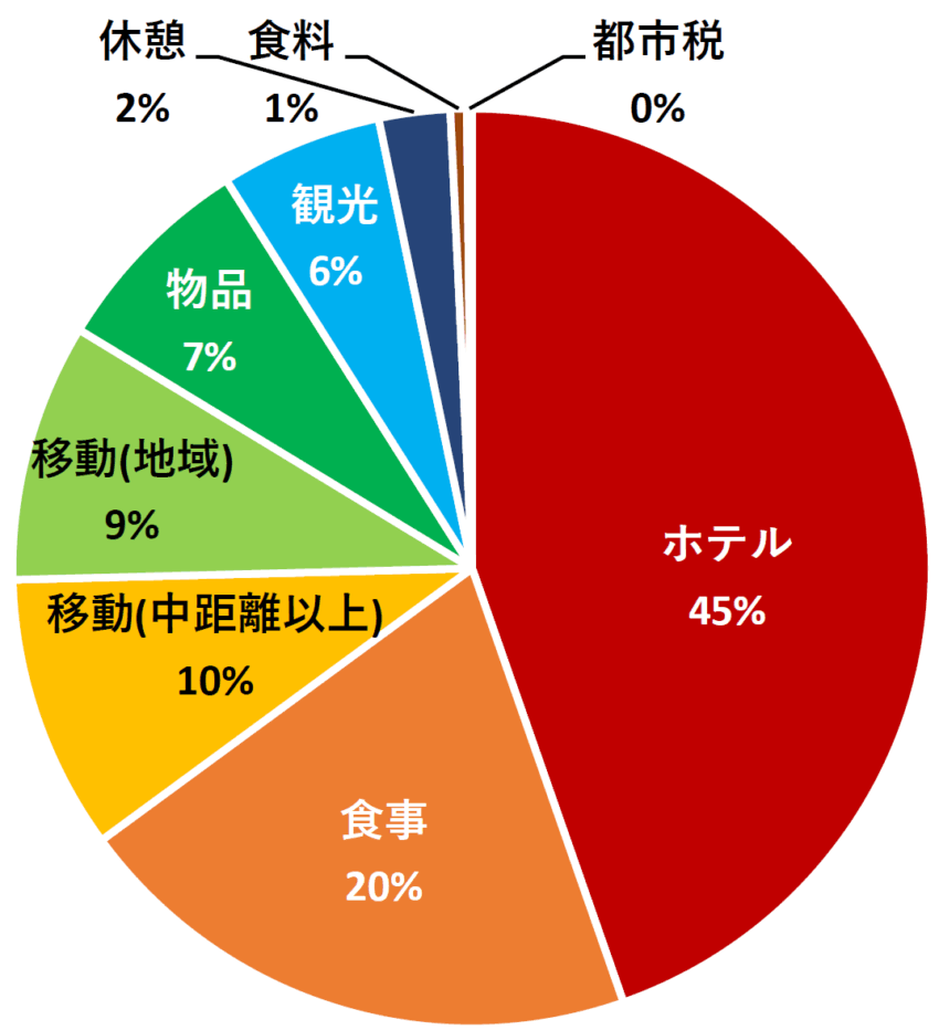 - ホテル:宿泊費用のこと。食事つきの場合、厳密には食費と宿泊に分割する必要があるが、簡単のため全額を「ホテル」に算入した(本旅行では食事付きプランなし)。ここでは宿泊施設の種類は問わず、不動産のベッドや布団類で過ごすための費用を合計した。