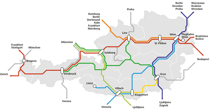 参考に長距離列車網を示します(図3)。左右に伸びる赤線が該当し、中央付近のザルツブルク(Salzburg)とリンツ(Linz)の間が本区間に該当します。