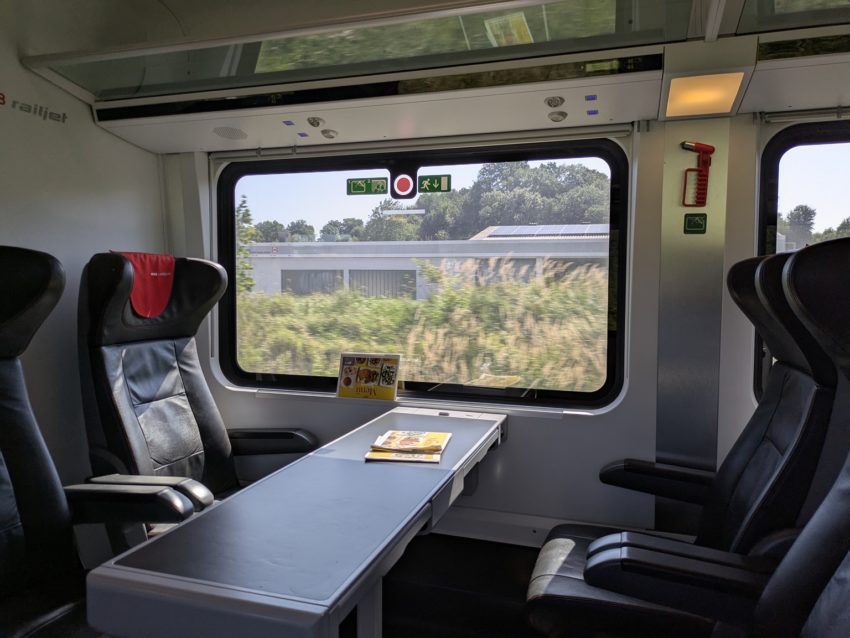 1等車は横2+1の横3列配列ですので、1人がけの座席もあります(写真7)。なかなか快適な座席です。日本の列車よりシートピッチが狭いのは、ヨーロッパではごく一般的です。