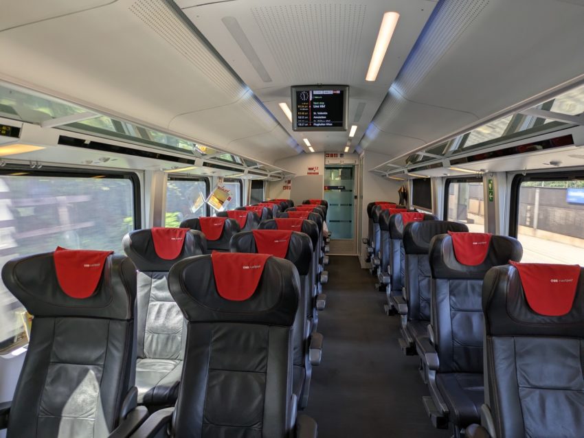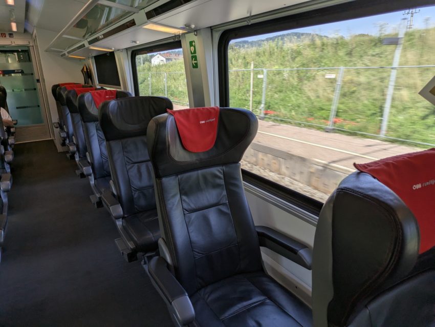 2等車はともかく、1等車はリンツまでガラガラでした(写真8)。リンツでも4分前にウィーンへの速達型のICEが設定されているためか、空いていました。