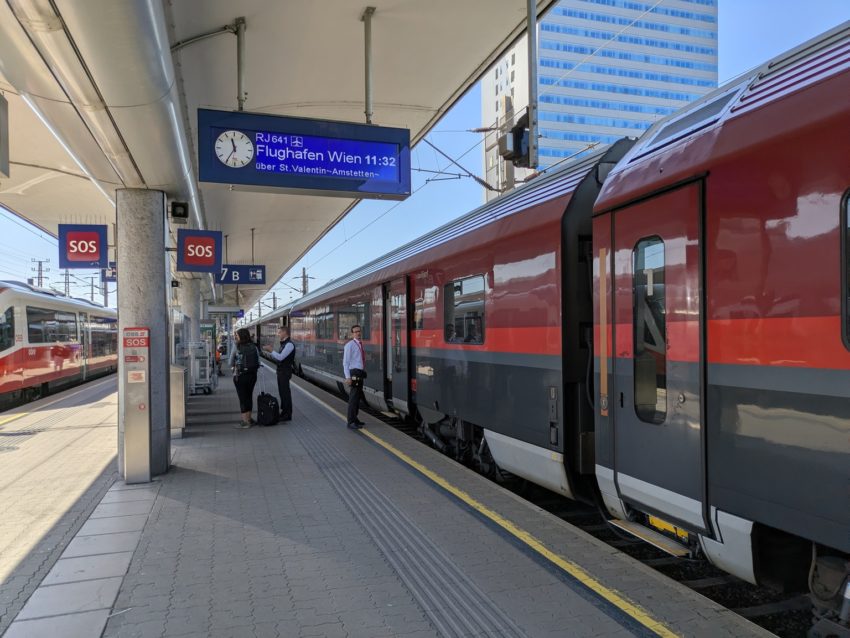 ウィーン空港行きが到着しました(写真3)。ザルツブルク始発であり、ザルツブルクでは先行の最速達便の4分後に発車していることから、そこまで混んでいないと予想していますが…。