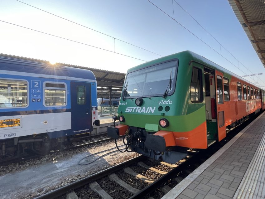 ここでズラター・コルナに停車し、チェスケー・ブジェヨビツェ行きとすれ違います(写真22)。銀色の車両もあるんだ!