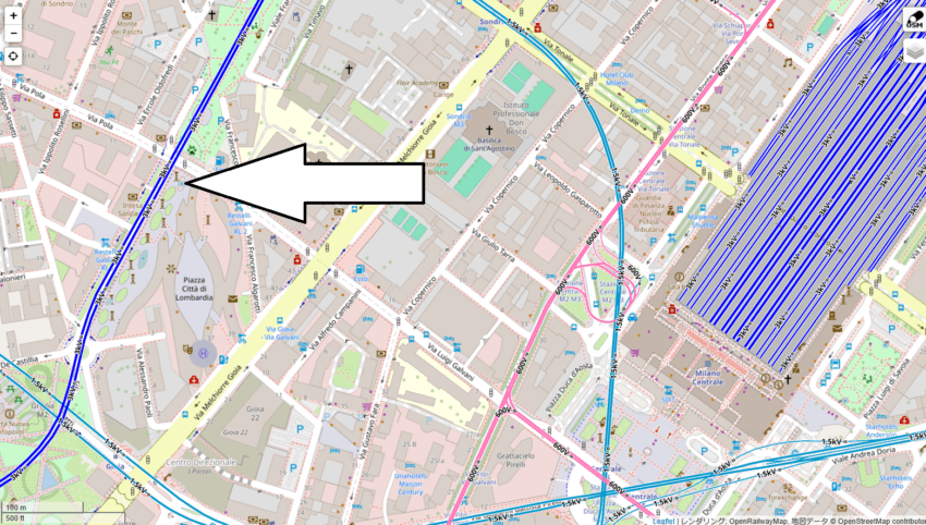 図8. ミラノ中央駅付近の走行経路(OpenRailwayMapより引用後加工)