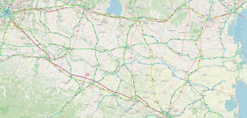 図6. (参考)ベネチアからミラノまでの最高速度(OpenRailwayMapより引用)
