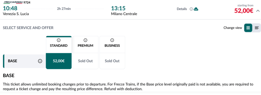 非常に簡単にまとめると、ある程度前もって予約し、かつキャンセルや変更に対し厳しい料金体系を選択すると安く済むということです。フレッチャロッサでもイタロでも20ユーロ以内であれば、わざわざユーレイルパスグローバルパスを使う必要はないでしょう。この日はスイスに入る予定があったことと、この旅行ではスイスやオーストリアを移動したので、ここはユーレイルパスグローバルパスを使う判断をしました。