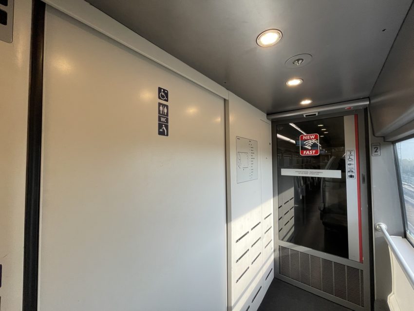 デッキの空間です(写真10)。途中でトイレに寄りましたが、トイレの使えない車両が多く、戸惑いました。デザインの国らしく配色は良いのですが…。