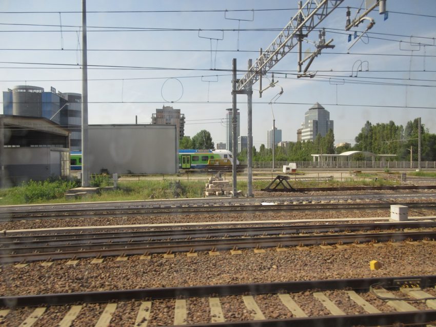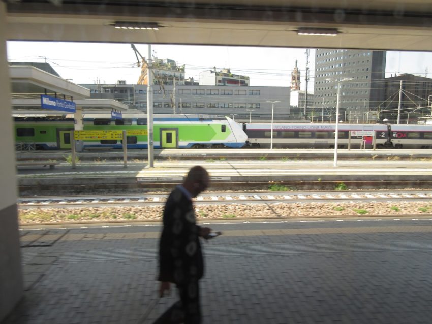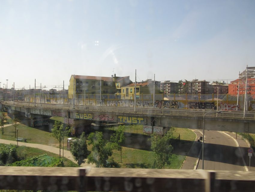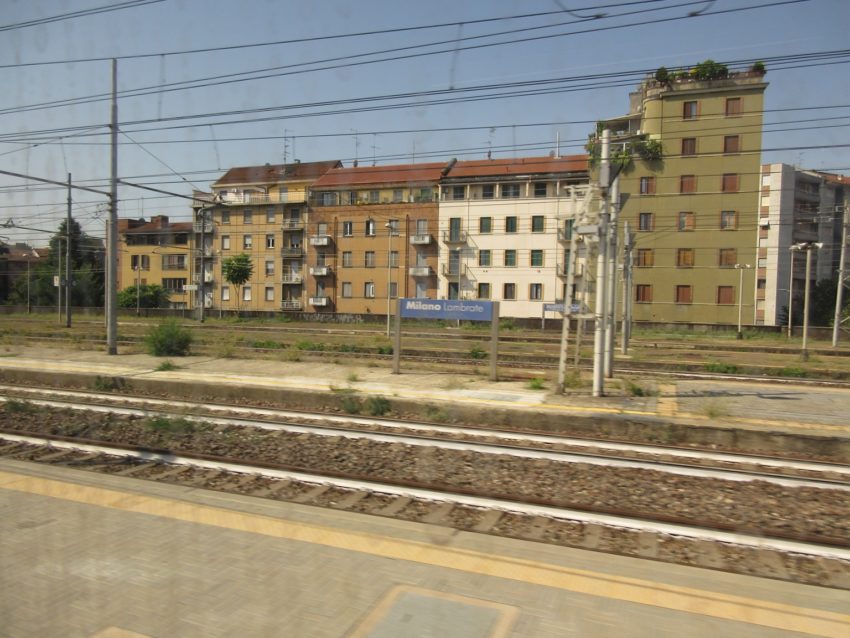 うっすらとミラノ中央駅が見えます(写真40)。歴史的経緯があるとは思いますが、都心を地下で縦貫する国鉄系の線路があれば、このように迂回する必要がなくなり、合理的に感じます(イタリア南部とミラノを結ぶ列車もいったんミラノ中央駅の北側を迂回する)。