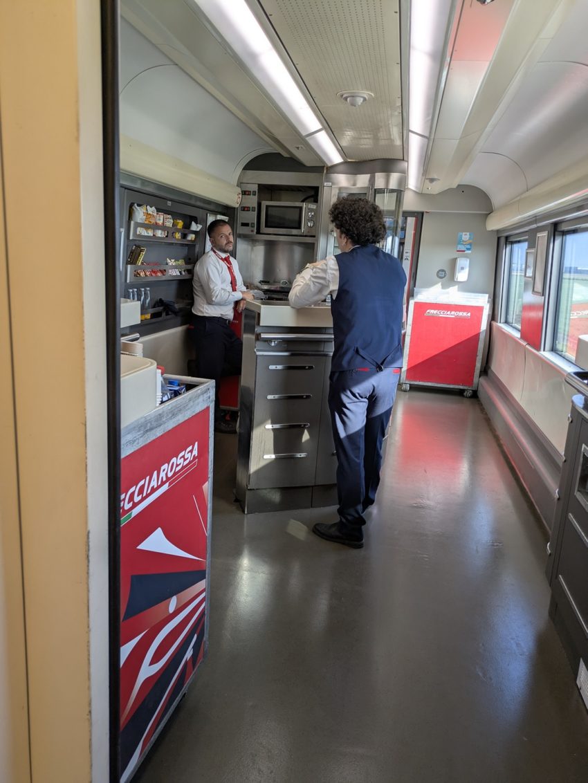 まあ、イタリアは美食の国ですので、あえて車内で食事することもないと理解することにしましょう(ETR700系を使用しない別の車両だと供食サービスレベルはこれより高いと聞きますが)。この後に乗った、スイス国鉄車の列車もミラノ発車時点では食堂車の営業はありませんでした…。イタリア国内で列車での供食サービスレベルには期待しないほうが無難でしょう。日本だと新幹線で車内販売もないことが基本であると比べると、こちらのほうがマシともいえますが…。