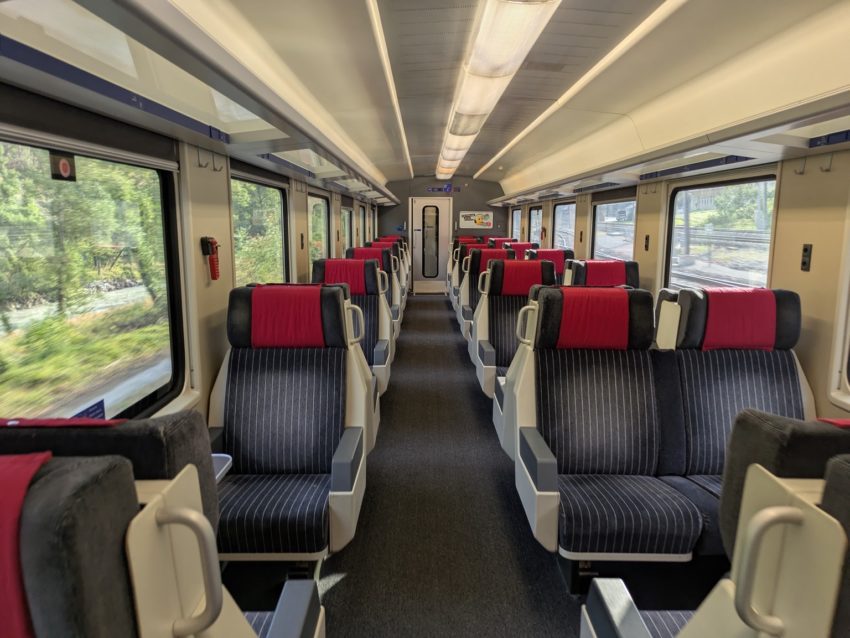 やはり空いています(写真5)。日本の感覚であれば、1等車を1両減車するか、1等車の連結をなくすでしょう。ただ、この区間は「末端」とも称することができ、ジュネーブから乗客が減ってくるという事情もあるとは思います(以前にこの系統のモントルーからローザンヌまで乗ったときはそれなりに座席は埋まっていました)。