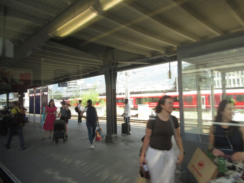 ホームで待つ人は意外と多いです(写真13)。レーティッシュ鉄道のダボス方面と国鉄のチューリッヒ方面の乗りかえ駅です。