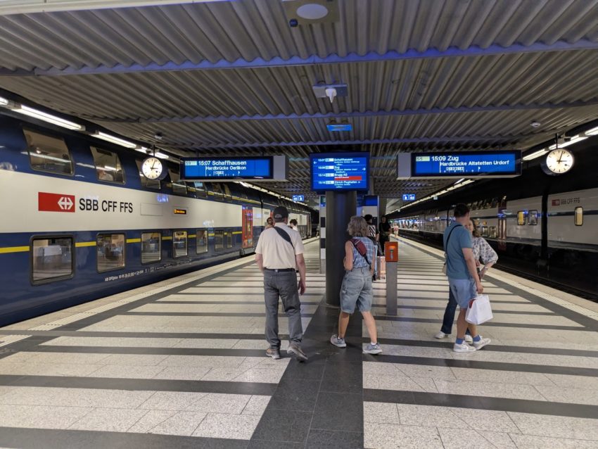チューリッヒ中央駅からSバーンで向かう場合は、41番線か42番線の先発電車に乗ります(写真2)。通常は1つ先のBahnhof Hardbrückeで分岐しますので、Bahnhof Hardbrückeまでしか乗らない今回の例であれば問題ありません。