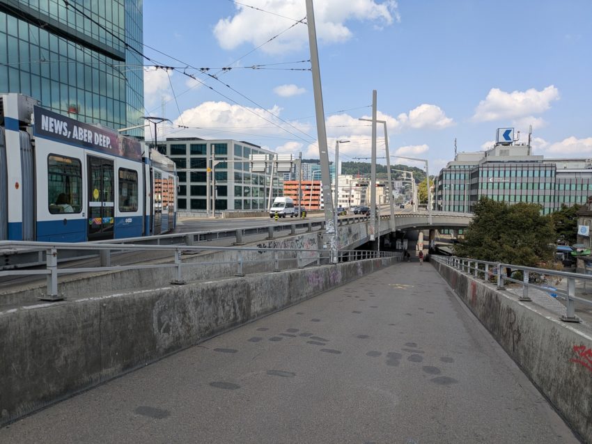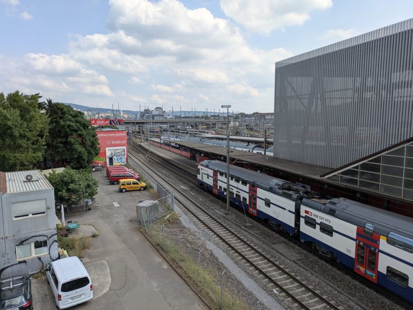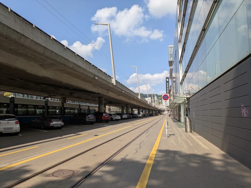 チューリッヒ中央駅からSバーンで1駅、Bahnhof Hardbrückeで下車します。駅の階段を登ると道路に接します。Sバーンの進行方向(だいたい西)に対し、右方向(だいたい北)に曲がります(写真3)。