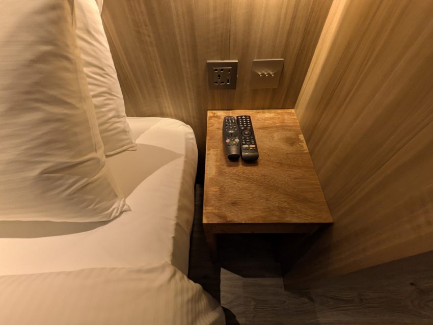 小さなテーブルがあります(写真9)。ここにも電源があり、充電環境はじゅうぶんと感じました。