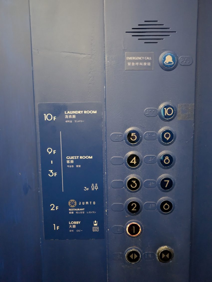 エレベータの様子です(写真20)。10Fにランドリーがあり、このホテルが高級ホテルということが証明された1つの場面です。