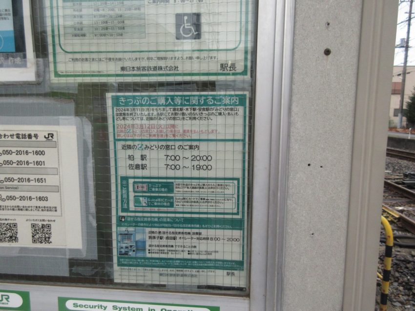 近隣のみどりの設置駅の案内です(写真6)。我孫子駅にみどりの窓口がないことは知っていましたが、反対側は成田駅にもないの?柏だったら直通電車で2駅目ですので、そちらのほうが良いでしょう。このあたりの人は柏に用があることも多いでしょうから…。