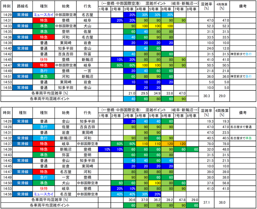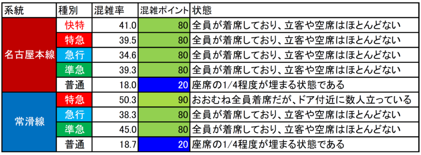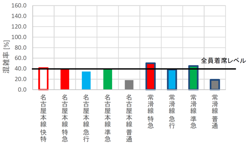急行や準急は特急系よりやや空いていますが、唯一中部国際空港発着の準急は混んでいる傾向でした。集計結果ではそこまで混雑していませんが、調査した時間帯の準急中部国際空港行きが6両編成と比較的長かったためです。これが4両編成であれば集計結果は60%近くとなり、それなりの混雑だったでしょう。