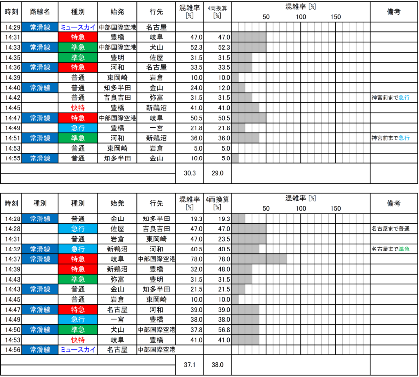 平均すると全員着席レベルの混雑ですが、特急系が混雑する傾向にあります(河和方面の特急は比較的空いてますが)。名古屋本線の特急は快特より空いている数値ですが、調査した時間帯の特急豊橋行きが8両編成(一般車だけでは6両)と長く、混雑率が低くなっています。もしも6両編成なら特急の混雑率は50%以上となり、快特より混雑する傾向です。同様に中部国際空港発着の特急も混雑する傾向でした。