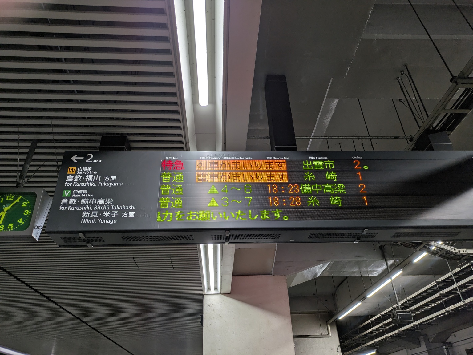 最混雑列車は岡山18:16発の普通糸崎行き(混雑率110%程度)でした。この列車は山陽本線の前列車が19分開き、かつ先発の普通糸崎行きの発車時点ごろからすでに並んでいる人たちがいる点も焦点でしょう。また、伯備線系統によるフォローもなく、倉敷までの利用客もこの列車に集中する点も指摘できます。