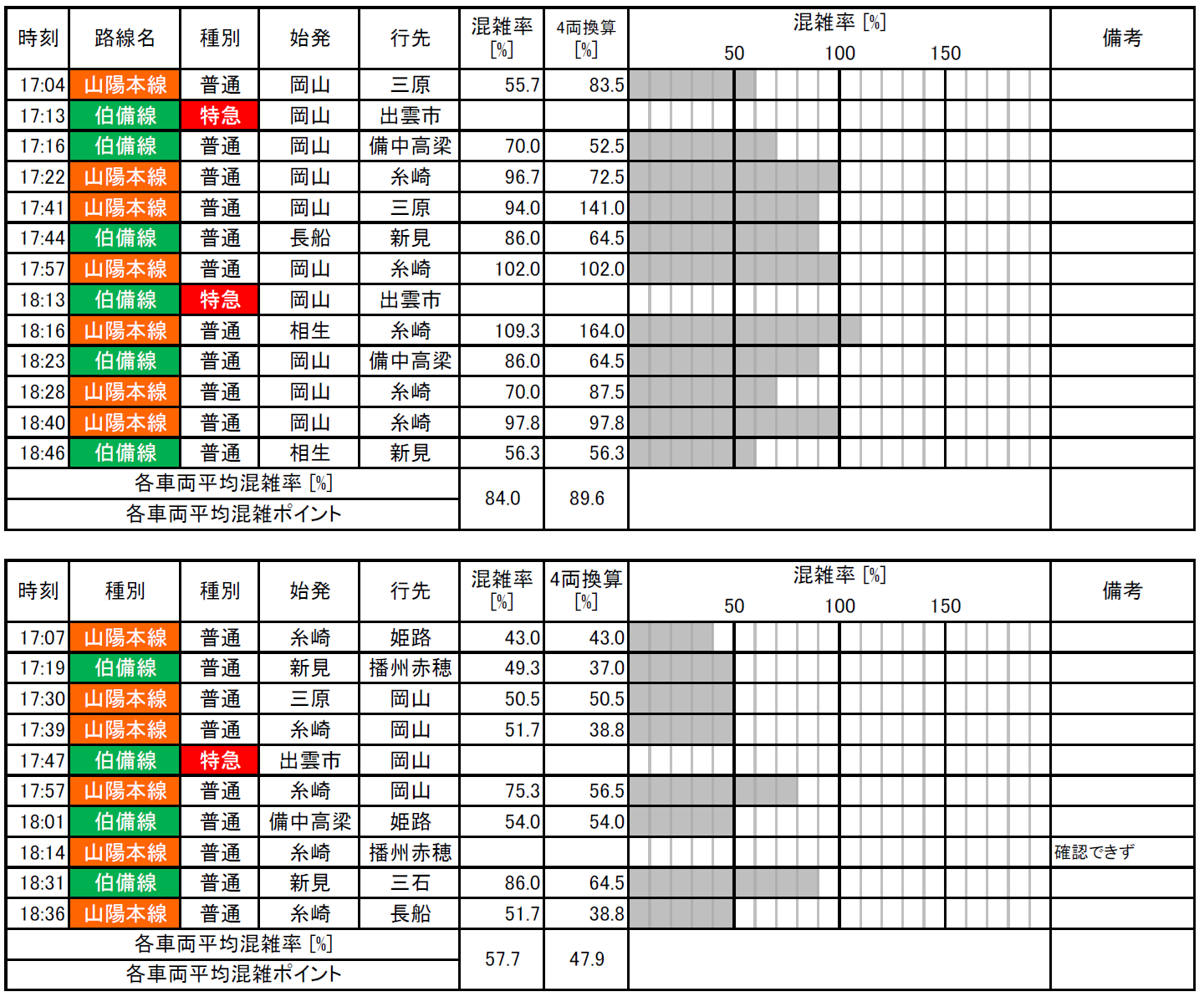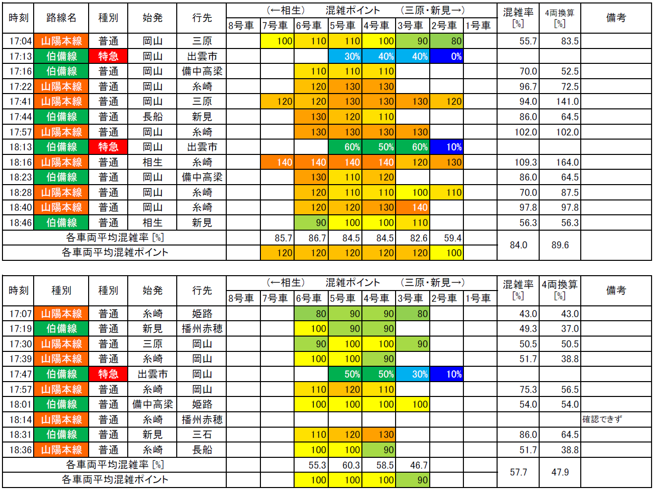 表2. 山陽本線岡山地区(岡山-北長瀬)の夕方ラッシュ時の混雑状況生データ
