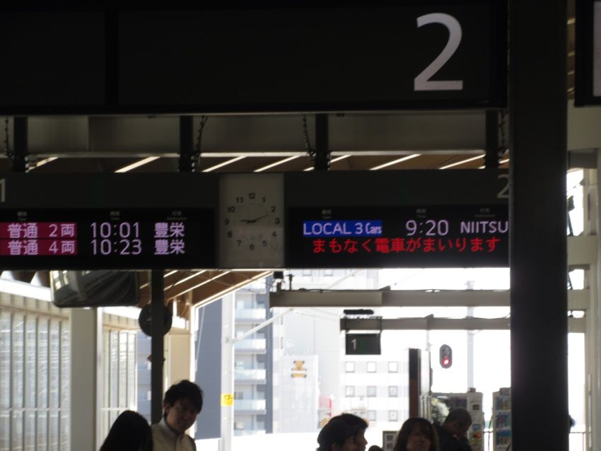 新潟駅の発車案内です(写真2)。JR東日本の地方の駅の特徴として、路線名の表記がないことです。