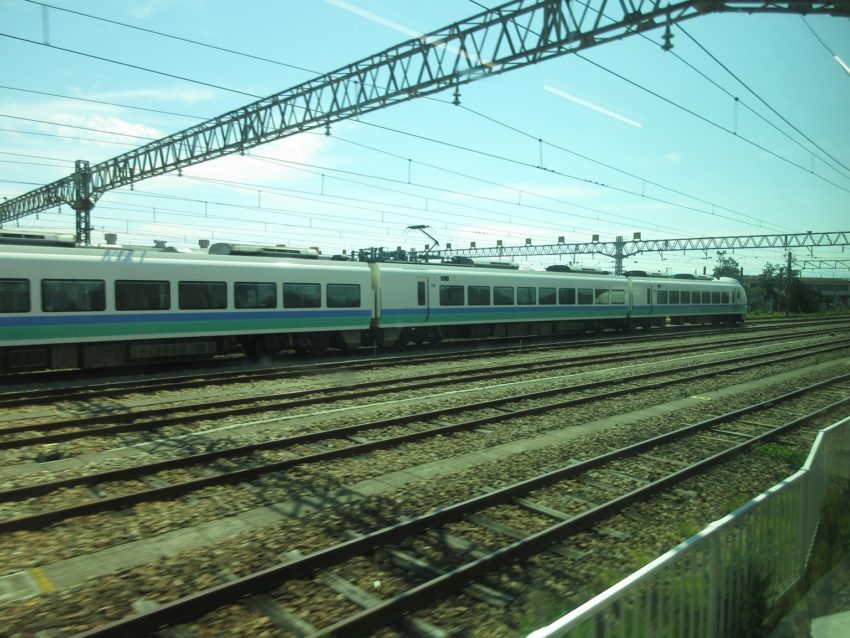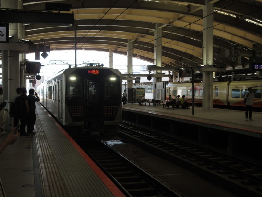 新潟を発車しました(写真6)。以前に信越本線で新潟駅に着いたときは、駅の片隅にある地上ホームだったので、5年経過し工事の進捗を感じます。