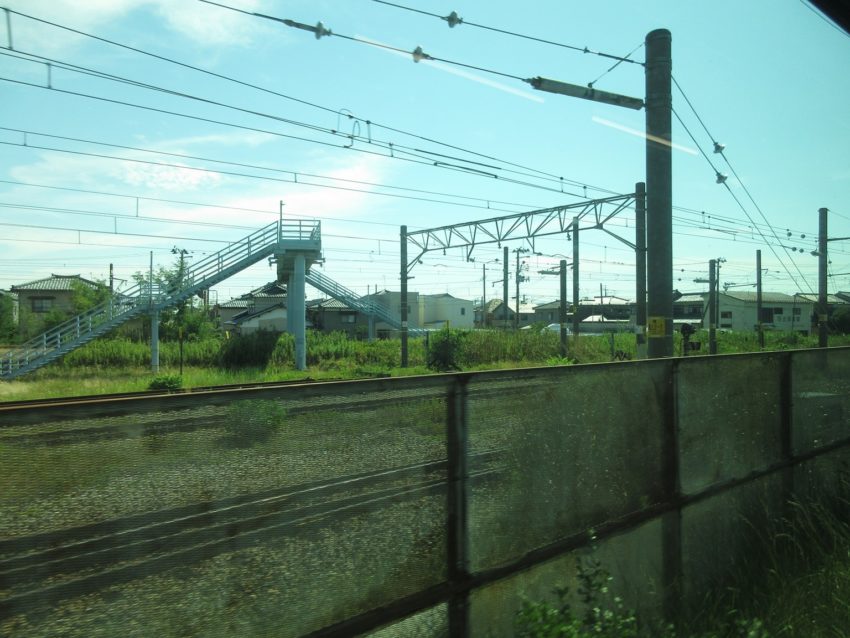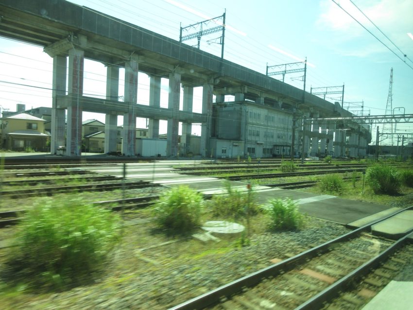 車両基地の近くを走ります(写真7)。上越新幹線の高架橋が見えますが、これは車両基地への回送線です。羽越新幹線が開業したあかつきには、営業列車が走るかもしれません。