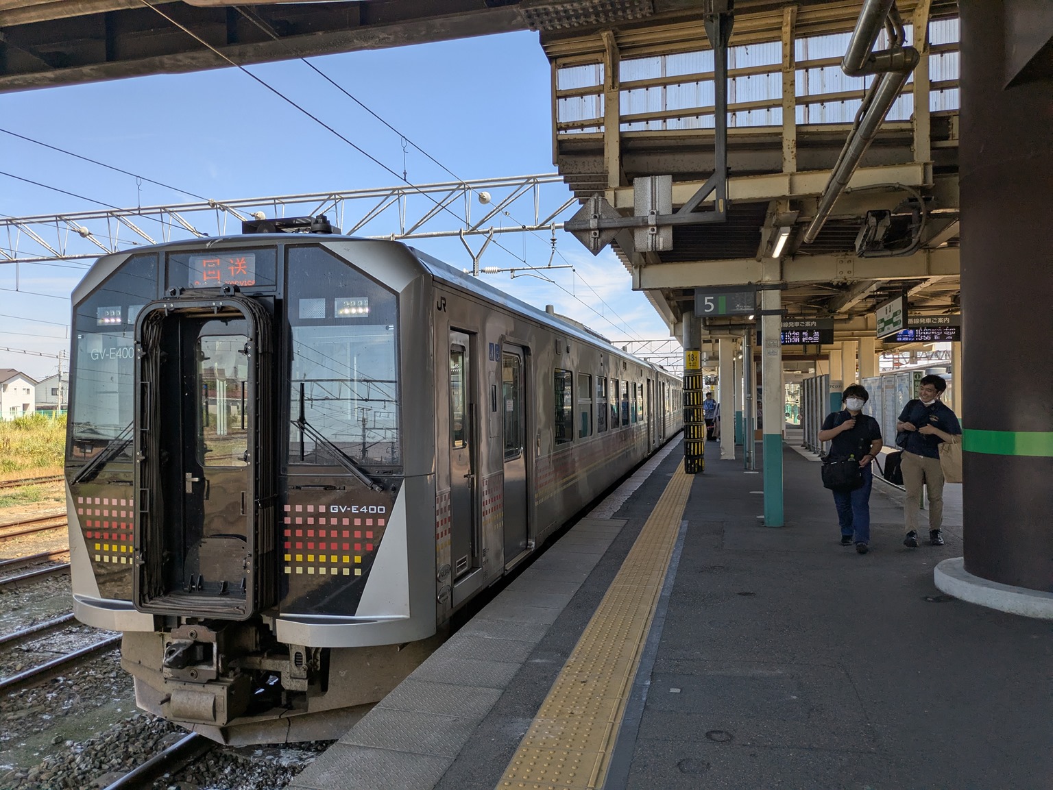 奇数両数ということで、E129系でなく、GV-E400系がやってきました(写真5)。新潟駅の解釈ではこの形式も電車扱いなのでしょうか。2020年に110系気動車による快速べにばなに乗ったときも電車と表記されていたので、車両形式に関わらず「電車」と表記するのでしょう。2ドアの乗車位置表示がなかったので、ちょっと不親切に感じました。