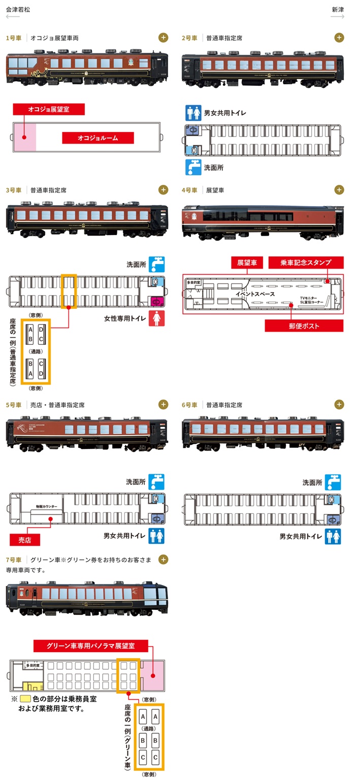 編成は7両編成で、1両はグリーン車、2両はフリースペース車両です。他の4両は4人がけのボックスシートです。いずれも指定席扱いで、指定席券が必要です。特急扱いでないため、特急券は不要です。