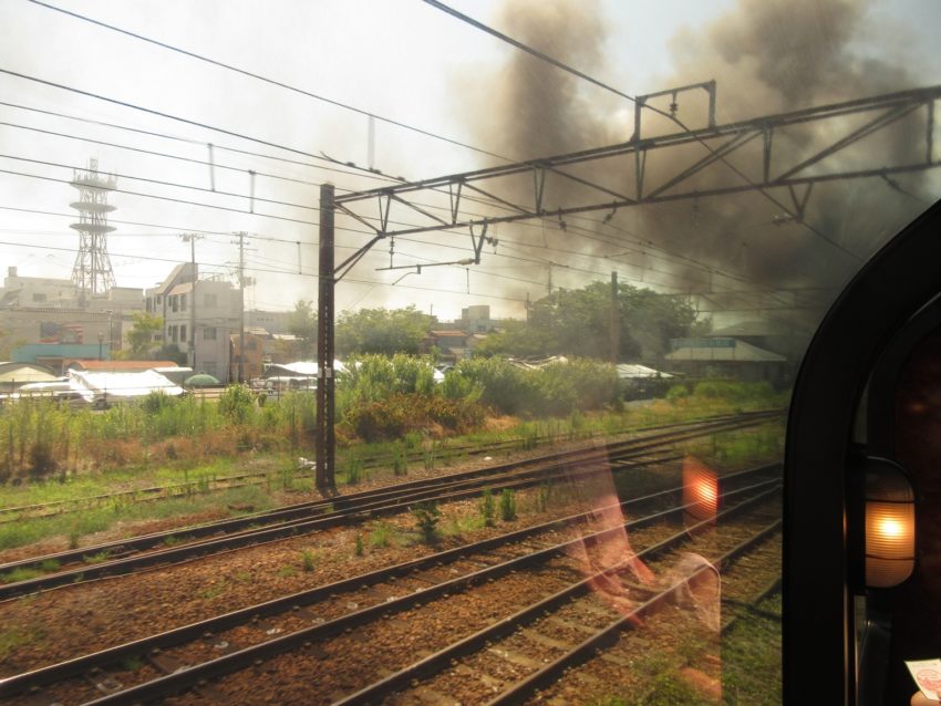 黒煙を確認できます(写真21)。たまに運転される観光列車ならともかく、毎日このような黒煙が発せられていたら沿線住民から良い視線を向けられないわけです(現状のSLばんえつ物語は沿線に歓迎されている印象でした)。