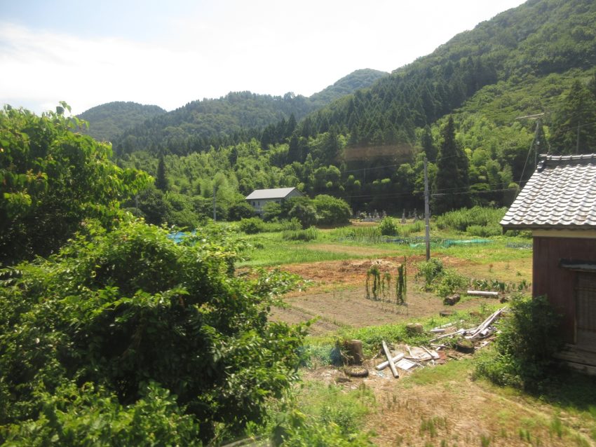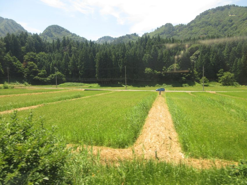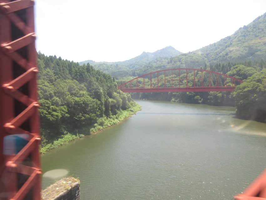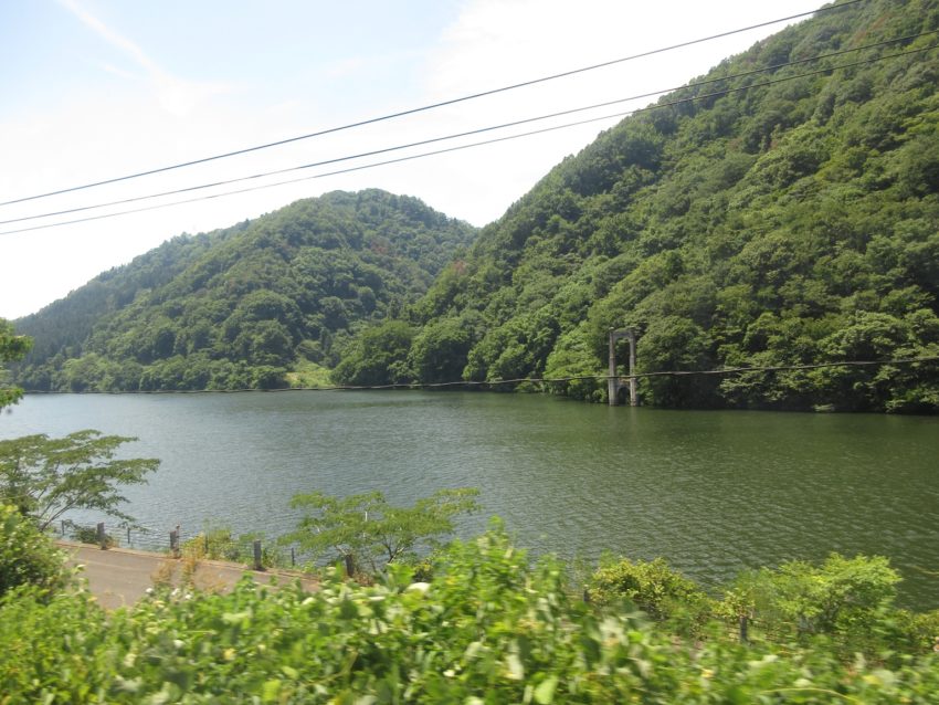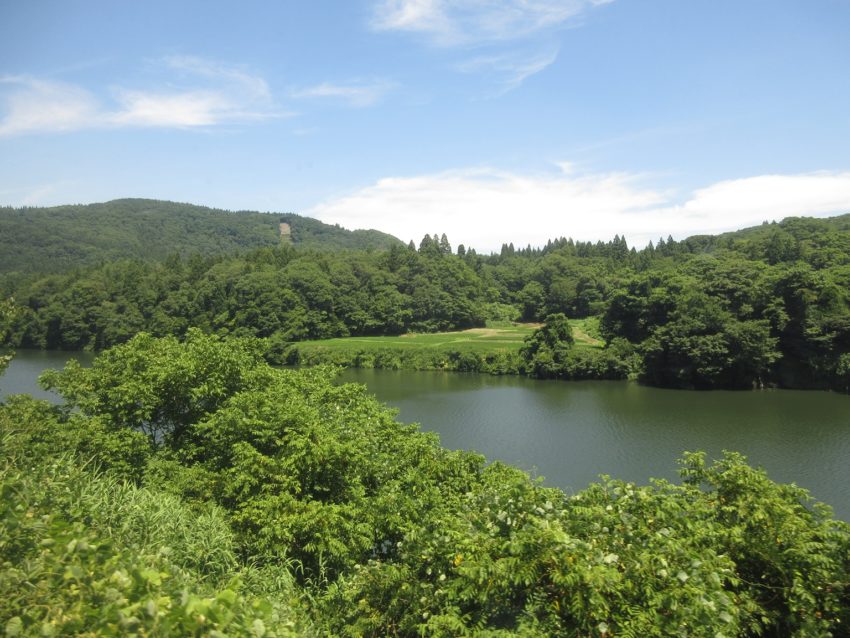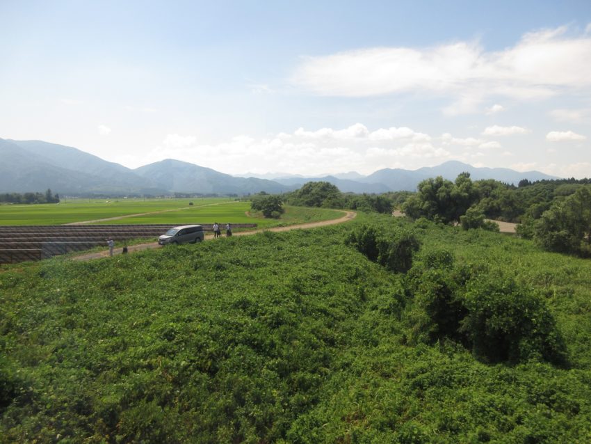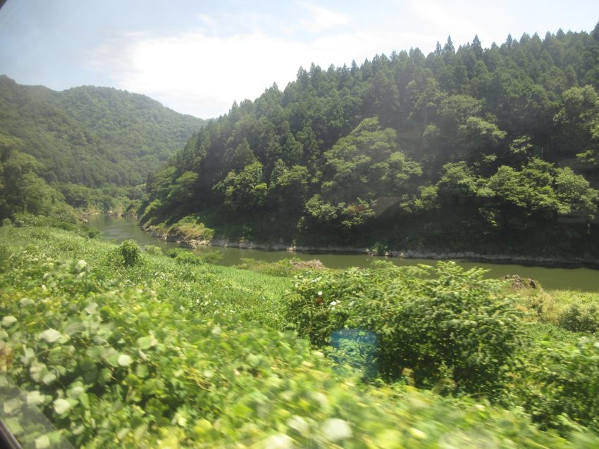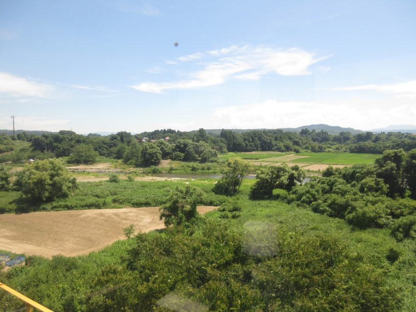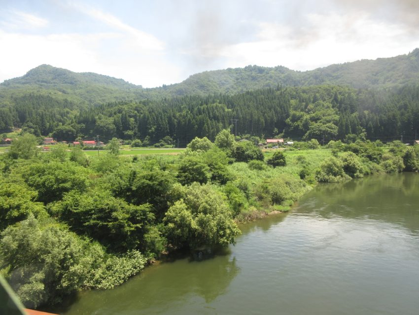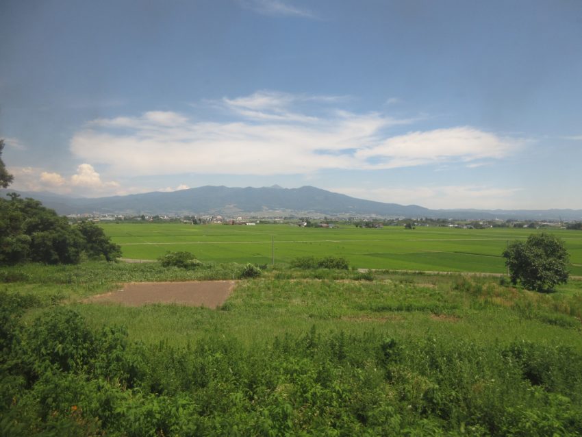 会津盆地が見えます(写真80)。ここから下ります。分水嶺を超えたと勘違いしていましたが、新津から会津若松までずっと川の上流に向かって進んでいるため、険しい地形の区間よりも標高は上がっています。