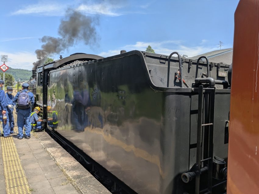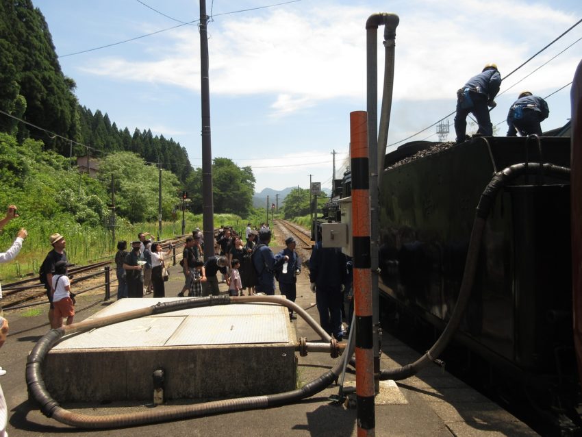 津川に停車します(写真42)。ここ津川では給水のために停車します。産業用ボイラーであれば水は常時供給されますが、SLは走行中に外部から水を供給できません。そのため、主要駅で水を補給するのです。