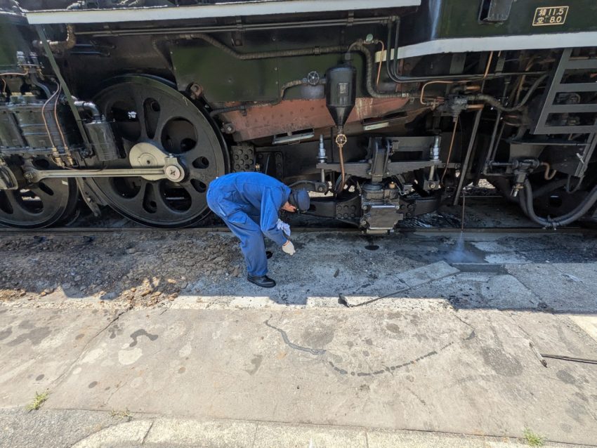 蒸気機関車は蒸気を使用しますが、蒸気は冷却されると液体に変わります。その溜まった水を抜いているのでしょうか(写真45)。このほか、注油作業もされていたように見えました。