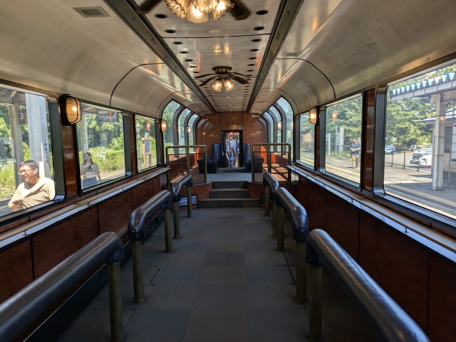 4号車に展望車両も連結されています(写真8)。雰囲気のある車両です。グリーン車には乗れていませんが、全般的にクラシカルさを前面に出しています。