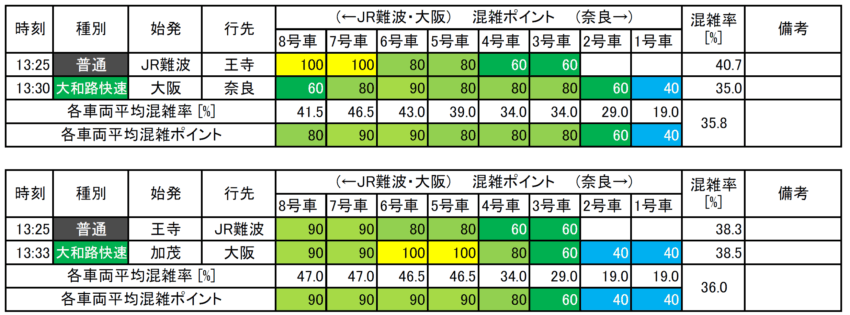 ダイヤのバランスが良いのか、混雑状況はほぼ均等です。大阪市内において普通の15分間隔というのは衝撃的ですが、利用状況をみる限り、適正レベルです。各駅停車タイプの本数を見ると、東京23区内の大手民鉄やJR線ではおおむね10分間隔が確保されており、大和路線の15分間隔は衝撃です。しかし、関西地区では大手民鉄でも12分間隔や15分間隔の路線もあり、許容下限レベルと表現できるかもしれません。